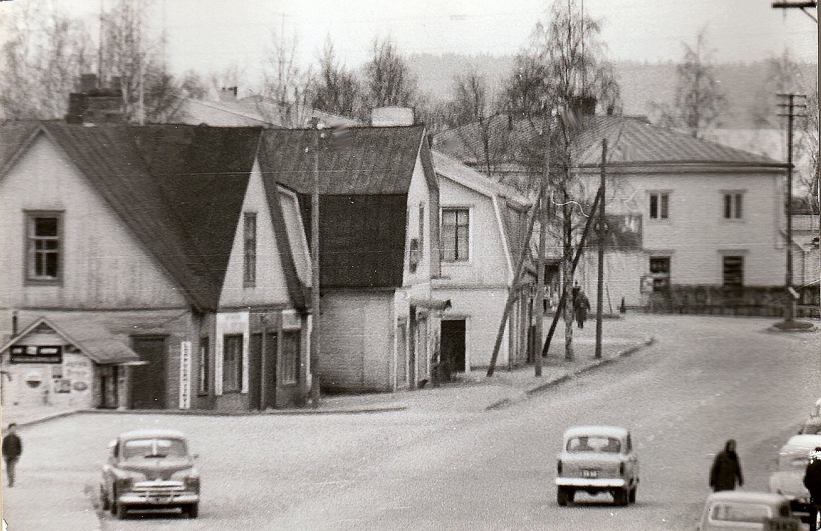 Nykyisen Jannen ja Yhteiskouluntien kulmaus. Vas. Säästöpankin talo. Oik. kyltti hammaslääkäri Sarkiolle. Etan talossa Paanasen autokoulu, jonka Pentti Häkkinen osti. Jouko Vesterisen kuva.