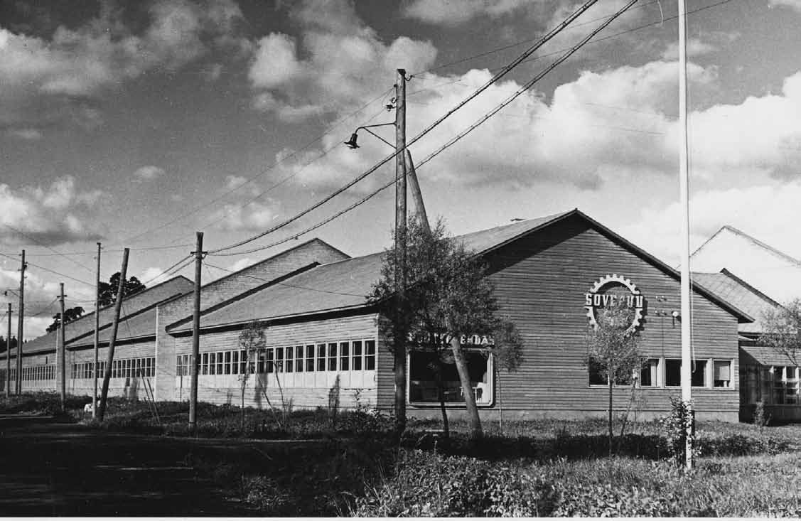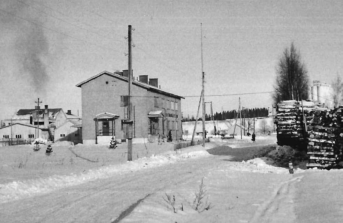 Puutyötehdas Sovepuu Vanhan Valtatien (nykyinen Pajalantie) ja Kaskitien kulmassa. Kuva on otettu 1950-luvun alussa.
