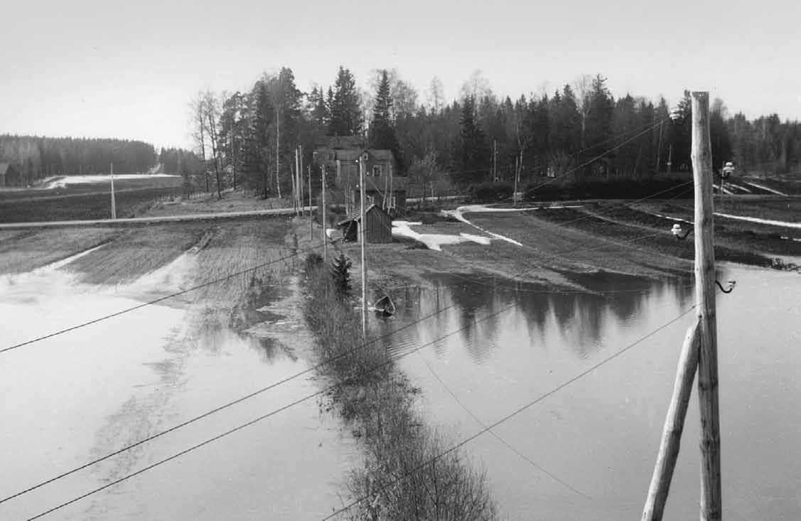 Tuusulanjärvi tulvii Vanhankyläntielle 1950-luvulla nykyisen Taidetalon kohdalla. Kuva otettu Harjuvaaran talon katolta. C Jaakko Harjuvaara