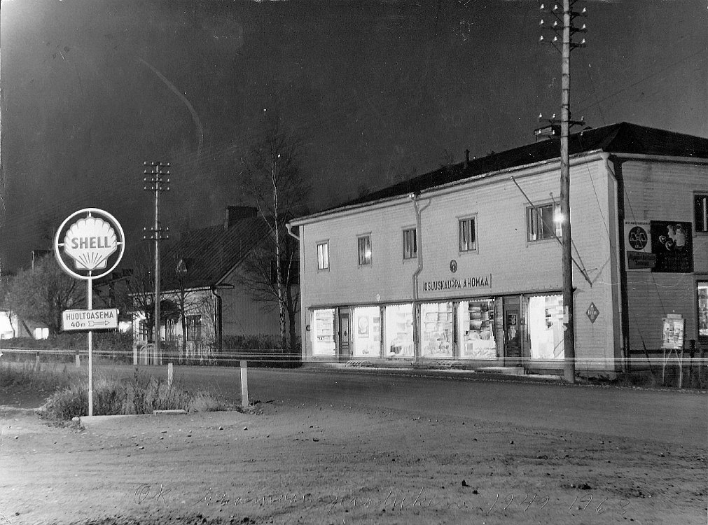 Ahomaan pääkonttori 1949-1963, loppuvuosina Ahomaan rauta- maatalousosasto. Shellin kyltti ohjaa Esko Raitasen huoltoasemalle Vanhankyläntielle. Vasemmalla kenkätehdas Eskon päämestari Kaarlo Mäntylän talo. 50-luvun loppupuoli, Paavo Karajas