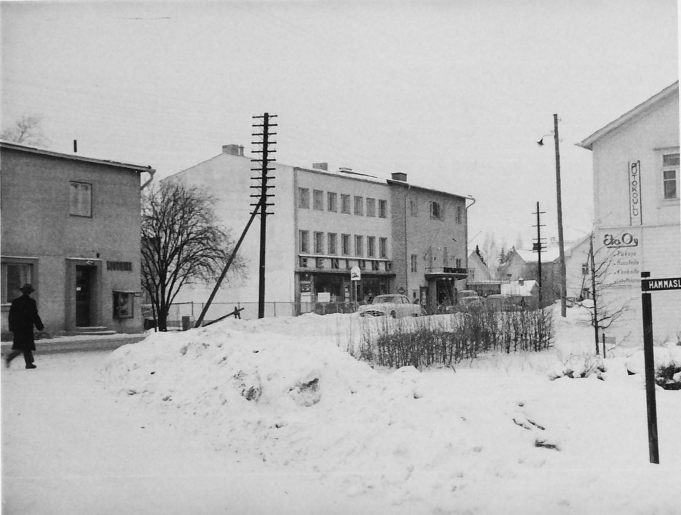 Nykyisen Jannen ja Yhteiskouluntien kulmaus. Vas. Säästöpankin talo. Oik. kyltti hammaslääkäri Sarkiolle. Etan talossa Paanasen autokoulu, jonka Pentti Häkkinen osti. Jouko Vesterisen kuva.
