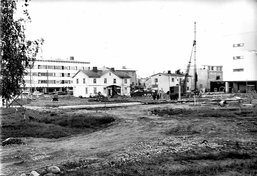 Toukokuussa 1963 Ahomaa-Sokoksen tontti nähtynä Yhteiskouluntieltä. Rakennustyömaan perustuksen ensimmäinen paalu. Kuvan keskellä kulkee 1962 valmistunut Helsingintie.