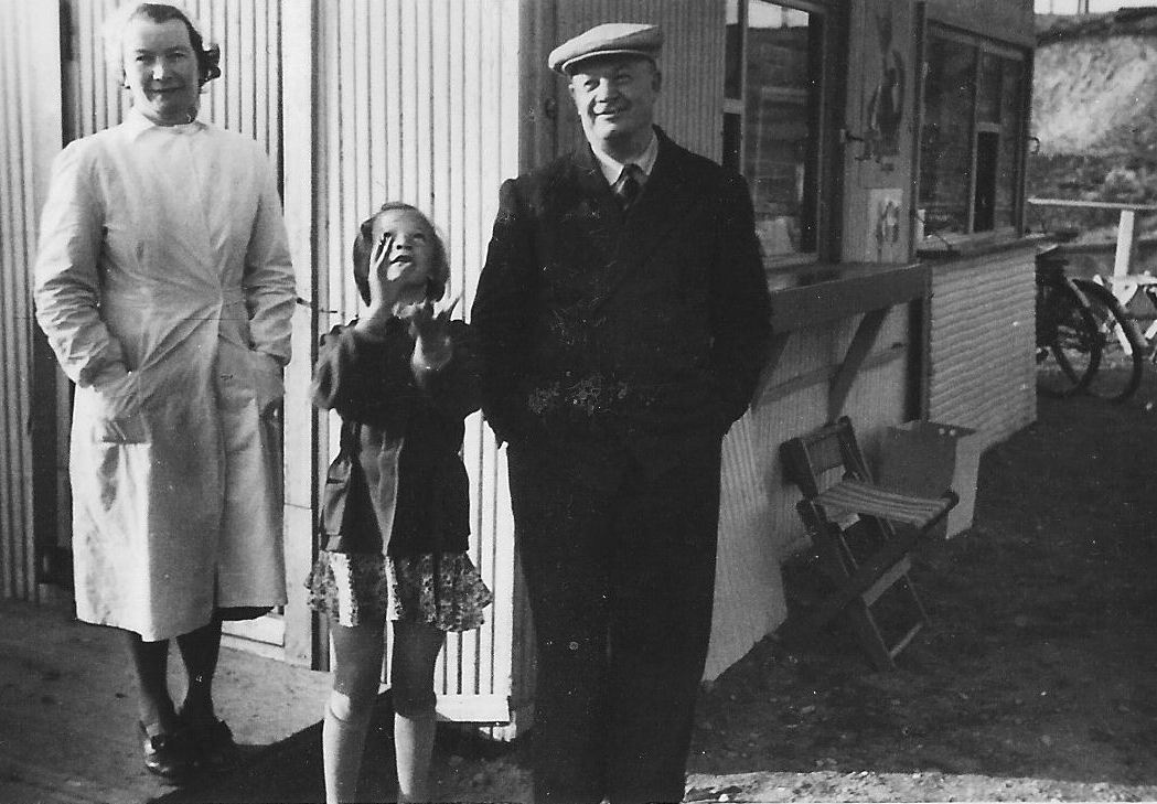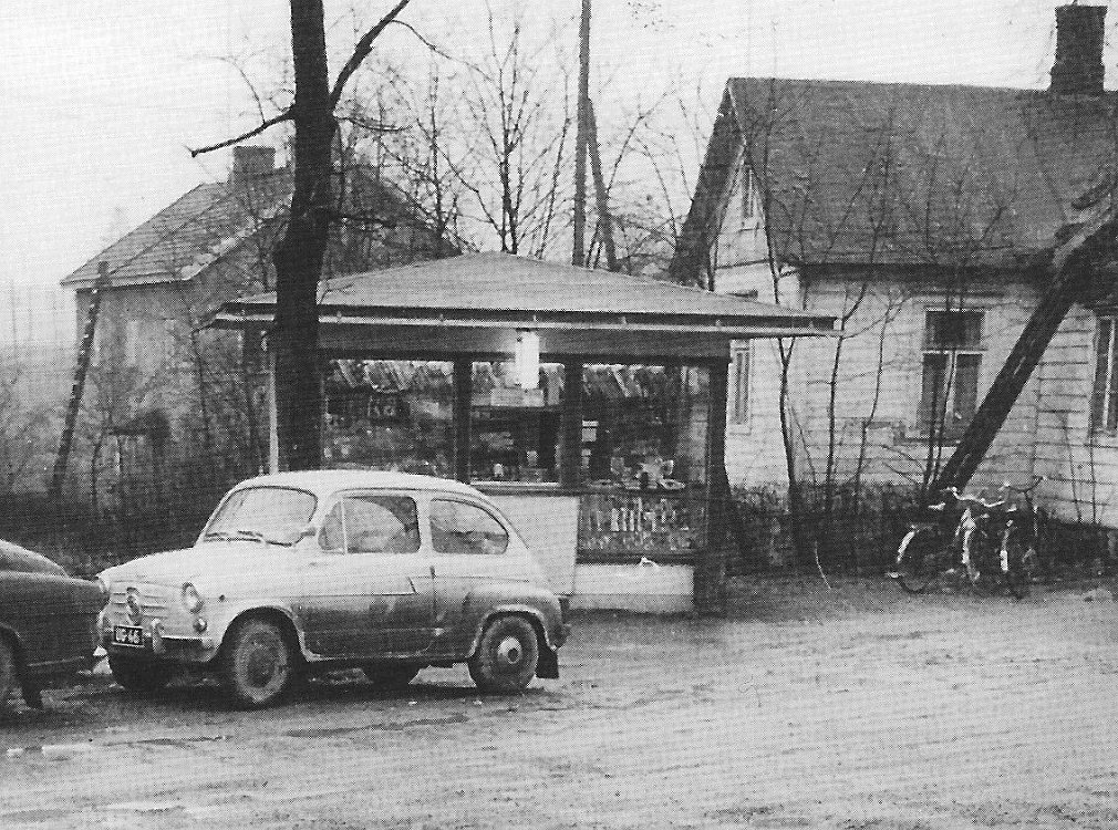 Helinevan perhe Kuprikan vieressä kioskilla, jossa liiketoiminta Järvenpäässä alkoi, taustalla rautatien pengerrys.