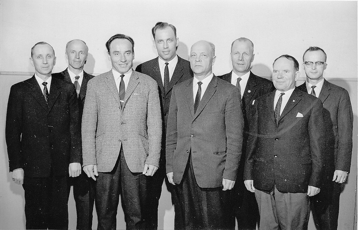 Palon johtokunta 1964, vas. Pentti Putkonen, Veikko "Porkkana" Rekola, Martti "Ruti" Kuivila, Erkki Sipilä, Toivo ja Veikko Juurinen, Tahvo Suokas ja Olavi Halme.