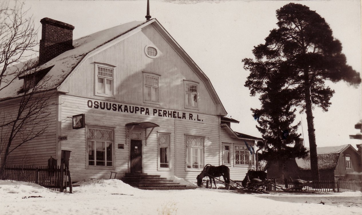 Osuusliike Väinölä, yläkerrassa toimi hotelli. Oikeasta kulmasta sisäänkäynti maitopuotiin. v. 1938. Seuraavassa kuvassa rakennus remontoituna.