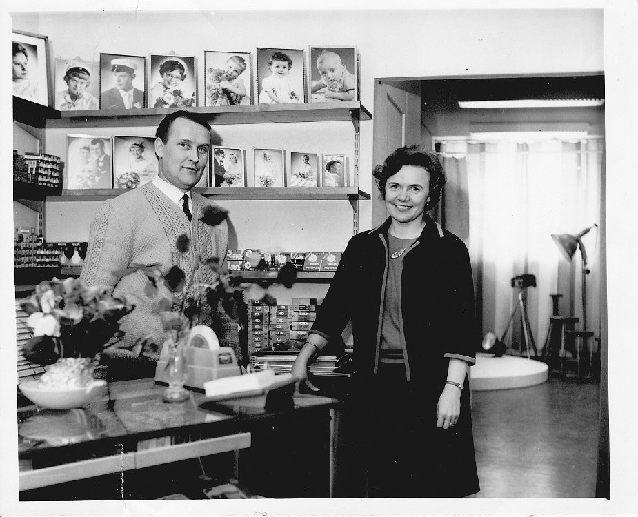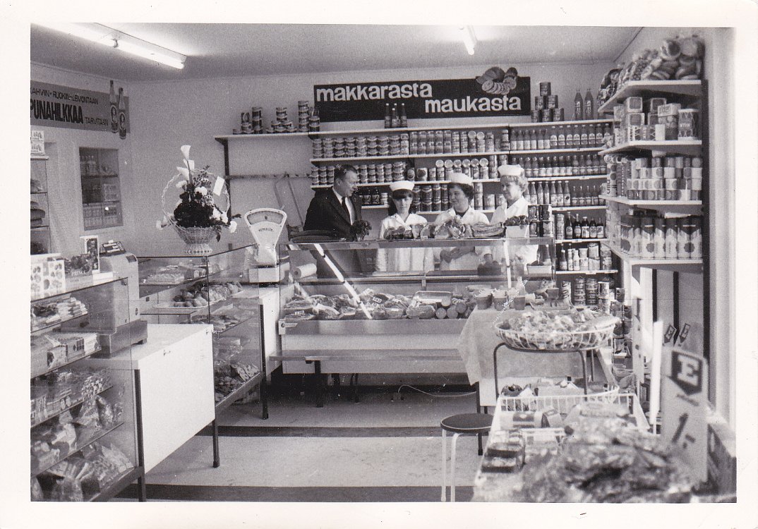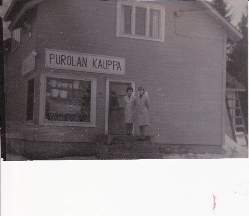 Åbergien kauppa Purolassa. Vasemmalla Anneli Åberg, oikealla kauppa-apulainen Ritva Huikuri.