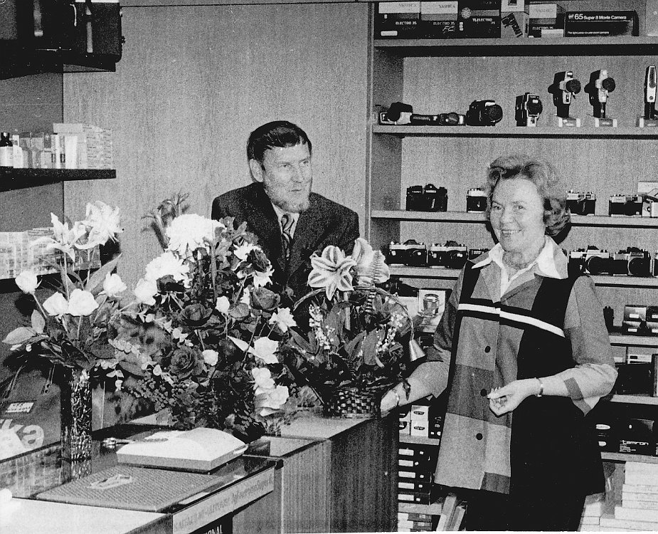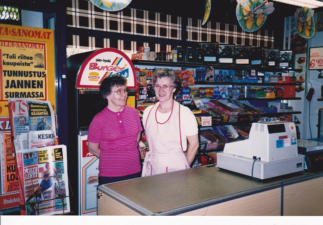 Vasemmalla kaupan vakituinen asiakas, oikealla Anneli Åberg. Taustalla iso mikrouuni, jossa lämmitettiin Burger-hampurilaisia.
