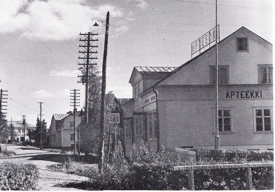 Vasemmalla Lehtosen liiketalo asemanmäessä, Kauppayhtiön taitekattoinen talo (siirretty Helsingistä vuonna 1926), Öhmanin talo ja Apteekki.