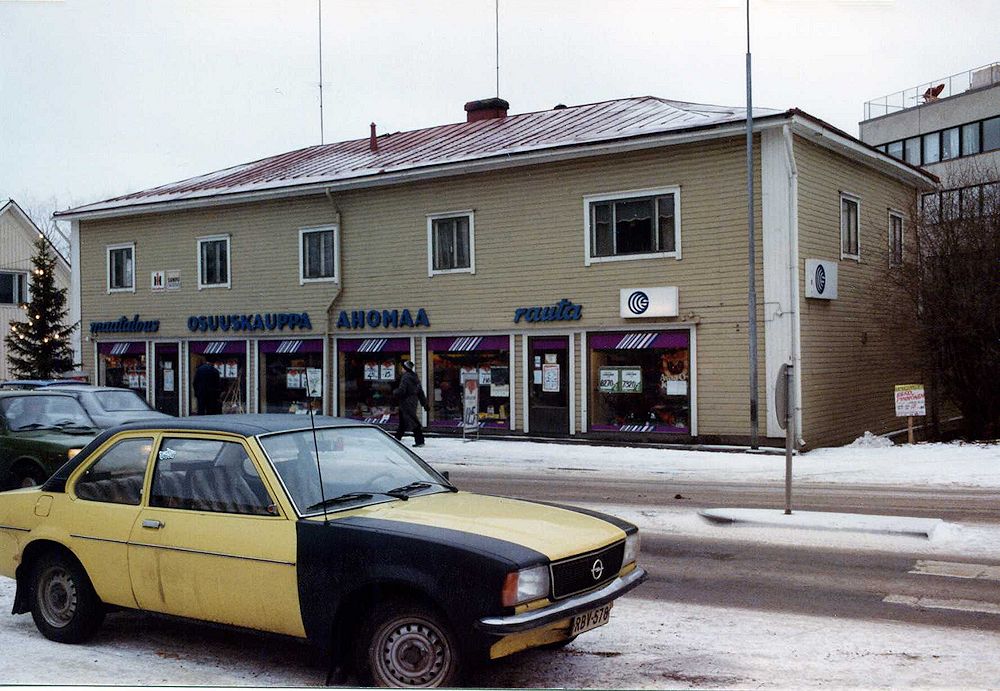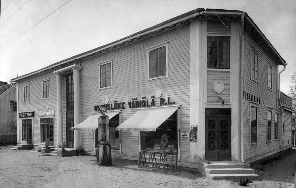 Osuusliike Väinölä. Yläkerrassa toimi aiemmin majoitusliike (sisäänkäynti talon keskeltä), kulmasta sisäänkäynti Väinölän mainopuotiin. Rakennuksessa toimi myöhemmin Ahomaan rauta- ja maatalousosasto.