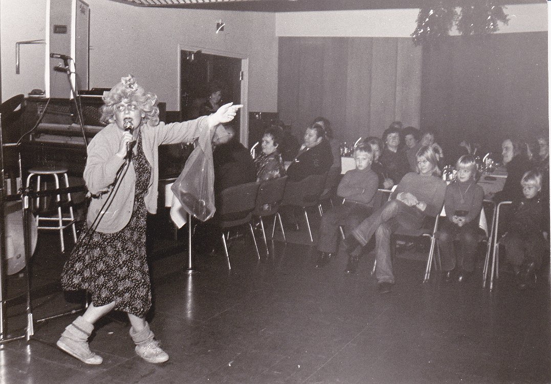Humoristi Kassi-Alma alias Marja-Leena Sukula vauhdissa Osuusliike Perhelän juhlissa.