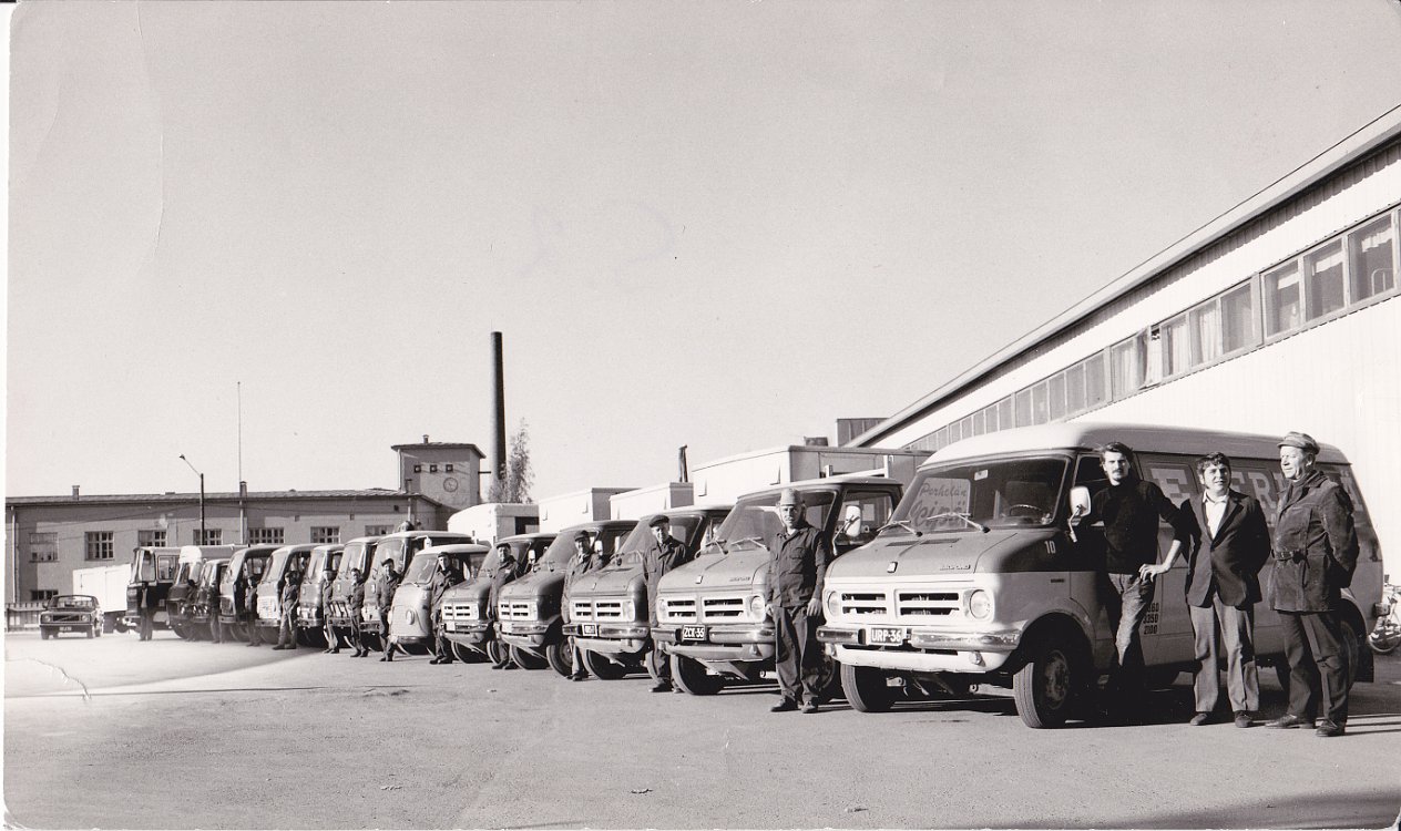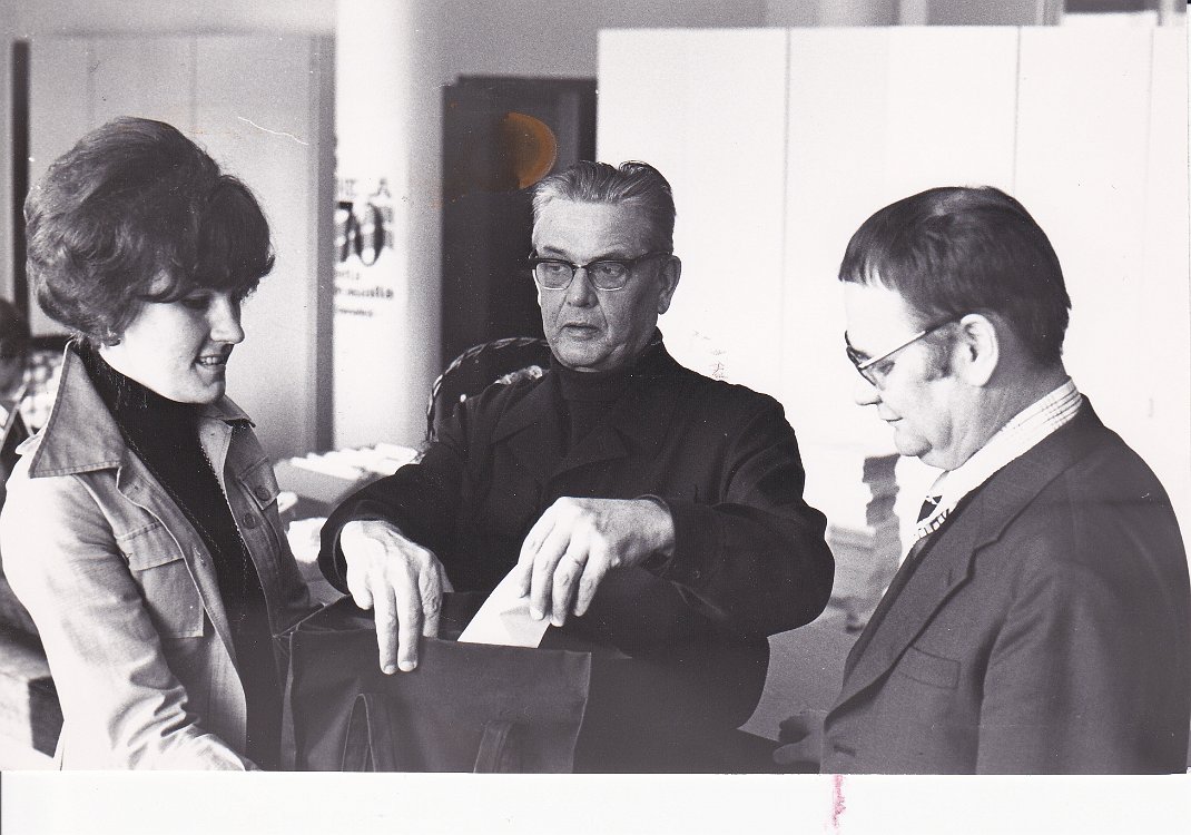 Vas. myymäläemäntä Helinä Järvinen, ? Eskelinen, Eino Kämäräinen ja konttoristi Alina Backman. Taustalla henkilöstöpäällikköTaisto Eskelinen.