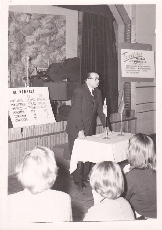 Osuusliike Perhelän jäsenhankitatilaisuus Työväentalolla. Kalle Valasma ja tunnusluvut 1958-59