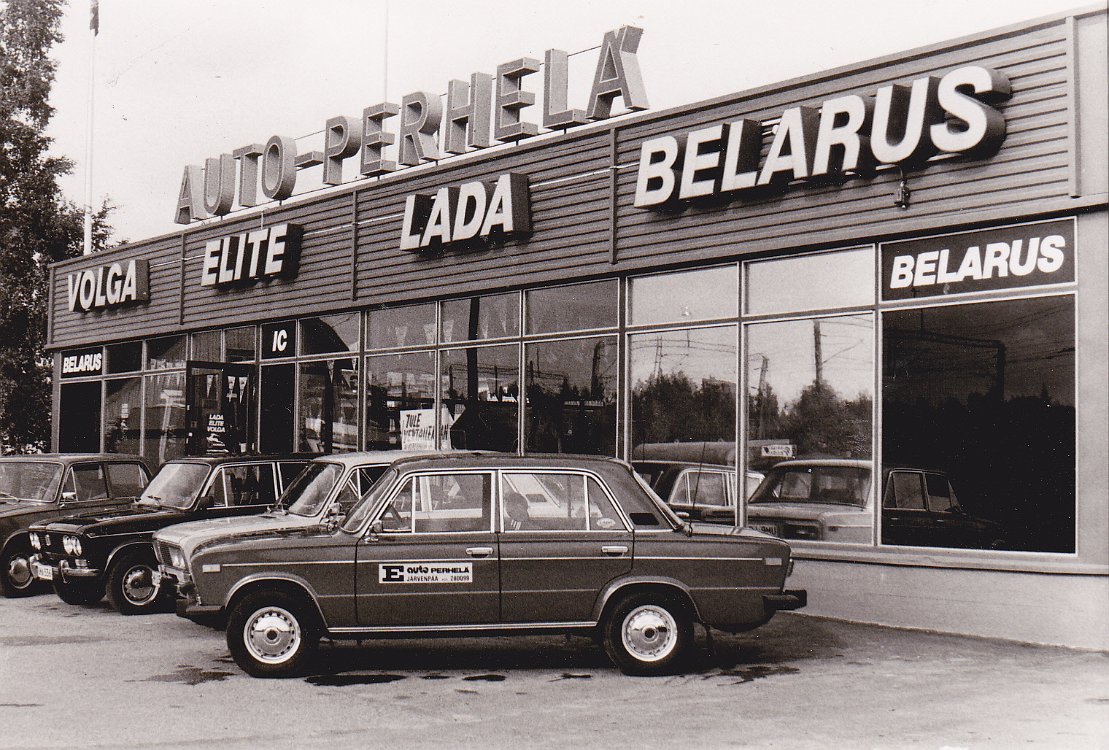 Åbergien kauppa Vanhankyläntiellä 1980. Myöhemmin kauppias Virolainen piti kauppaa. Oikealla Annelin Saab.