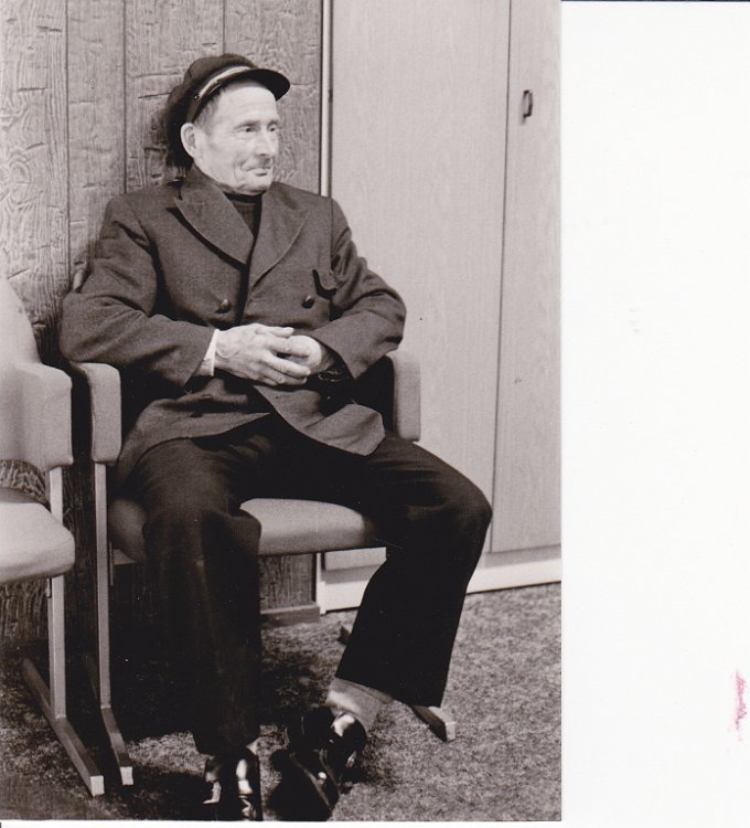 Perhelän 60v-juhlassa Auvo Nuotio ja ihailija. Taustalla viirullisissa paidoissa Hootenanny Trio, vasemmalla haitarin kanssa George de Godzinsky ja keskellä Ahti Kostet.